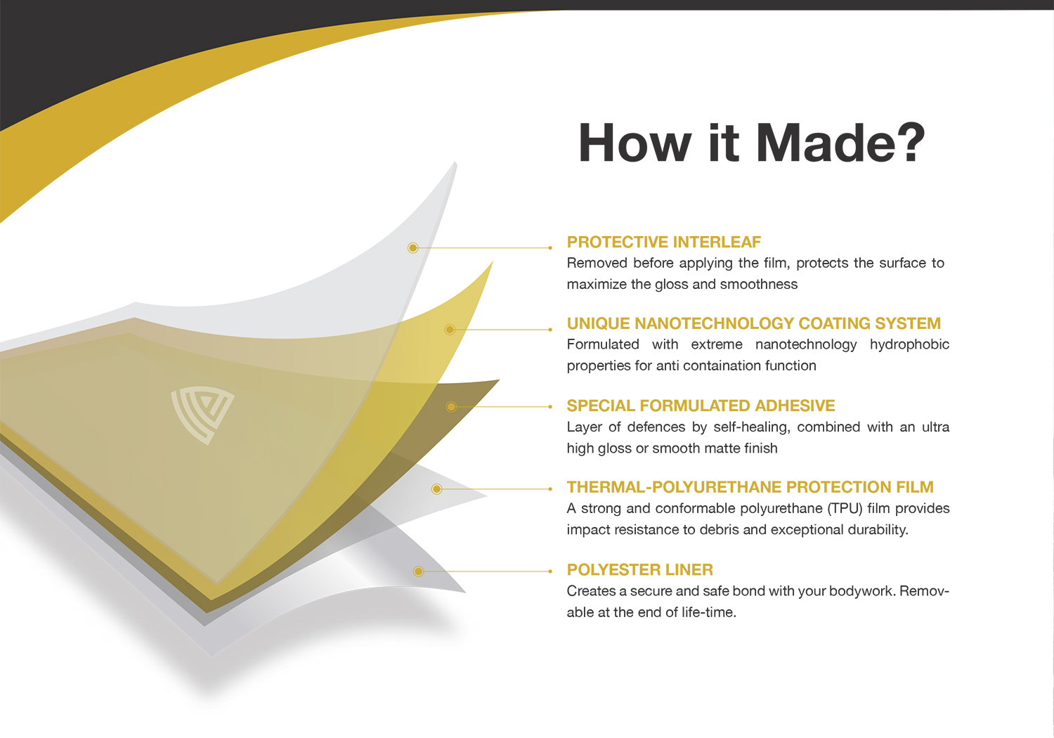 UltiMax Paint Protection Film (PPF) or referred to as clear bra is a tough, clear barrier that acts like body armour for your car paint. It’s a virtually transparent layer of urethane film that helps protect your paint effectively against stone chips, scratches and stains caused by road debris, tar, dirt, dust, acid rain, bird’s droppings, tree saps, insects and more. It is designed to protect your car in every conditions.